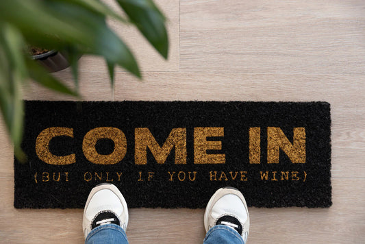 Dørmåtte - sort og guld - "Come in (But only if you have wine)"
