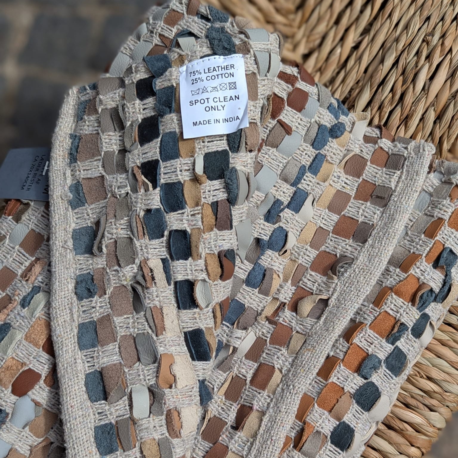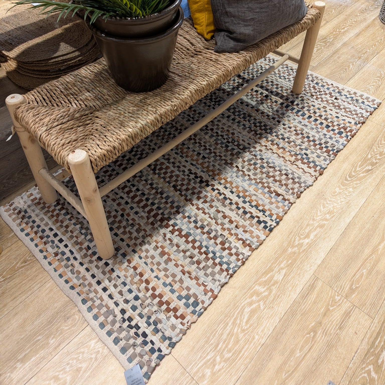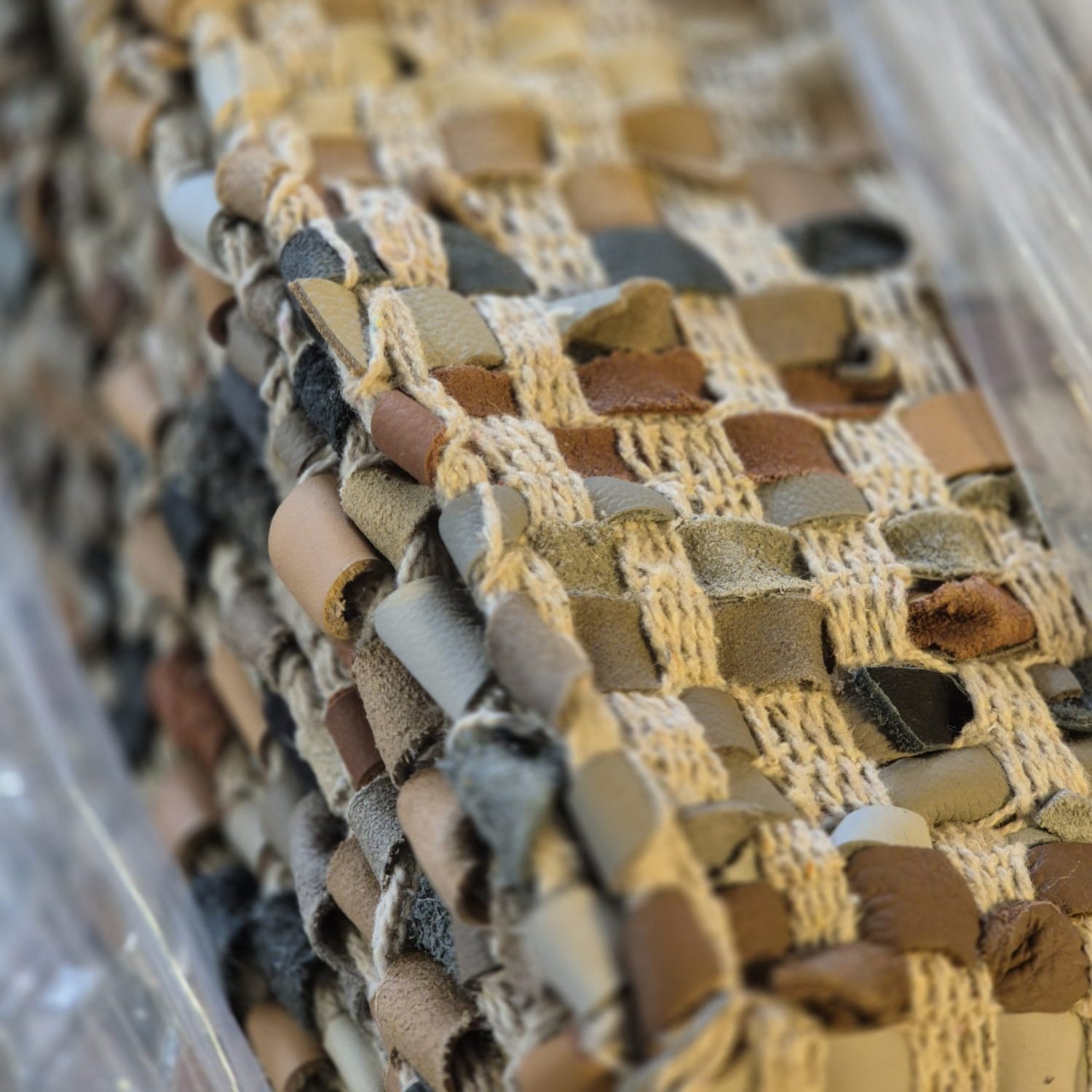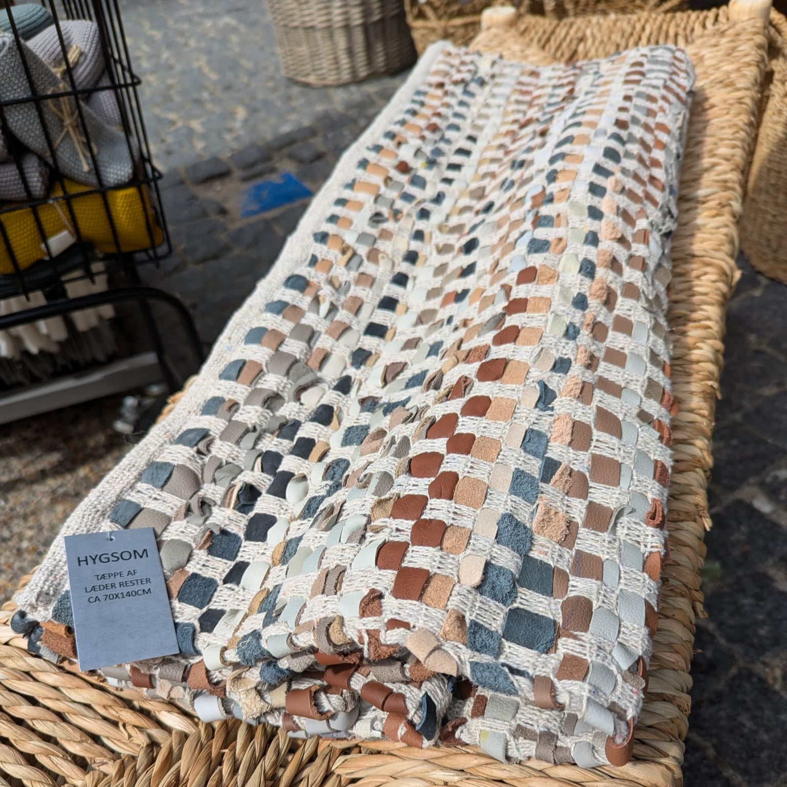 Smart, håndlavet gulvtæppe lavet af læder og bomuld. Tæppet er lavet af genbrugte læderrester, hvilket giver det et unikt look og gør det til et bæredygtigt valg. Tæppet måler cirka 70 cm x 200 cm.