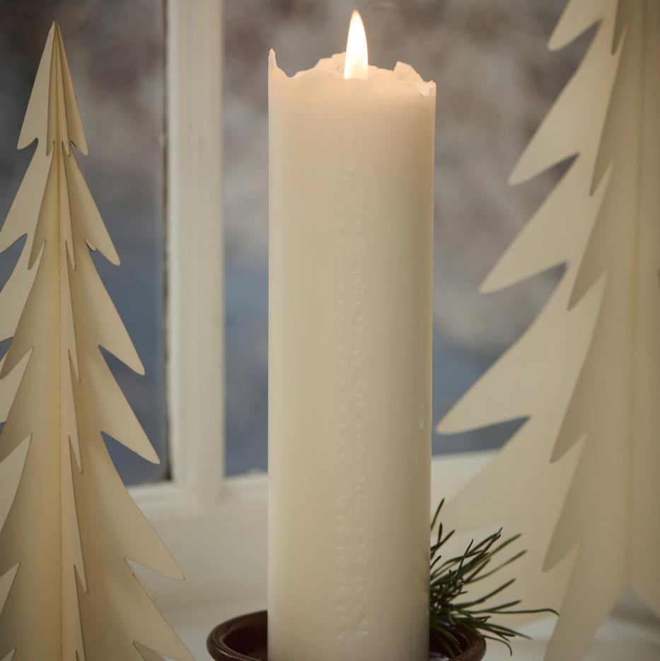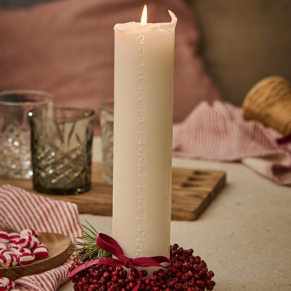 Kalenderlyset er hvidt og 30 cm højt og 6 cm i diameter. Brændetiden er cirka 120 timer.