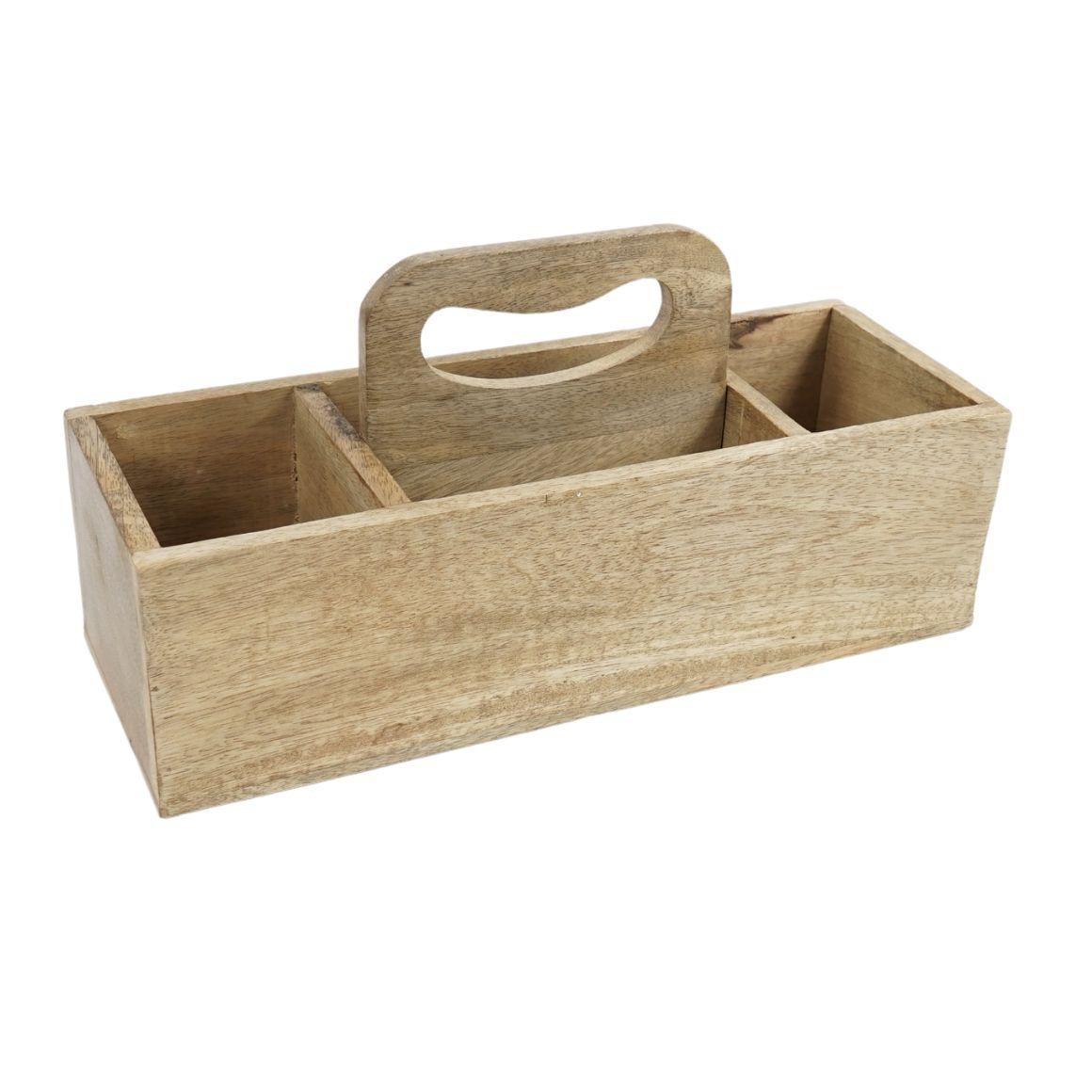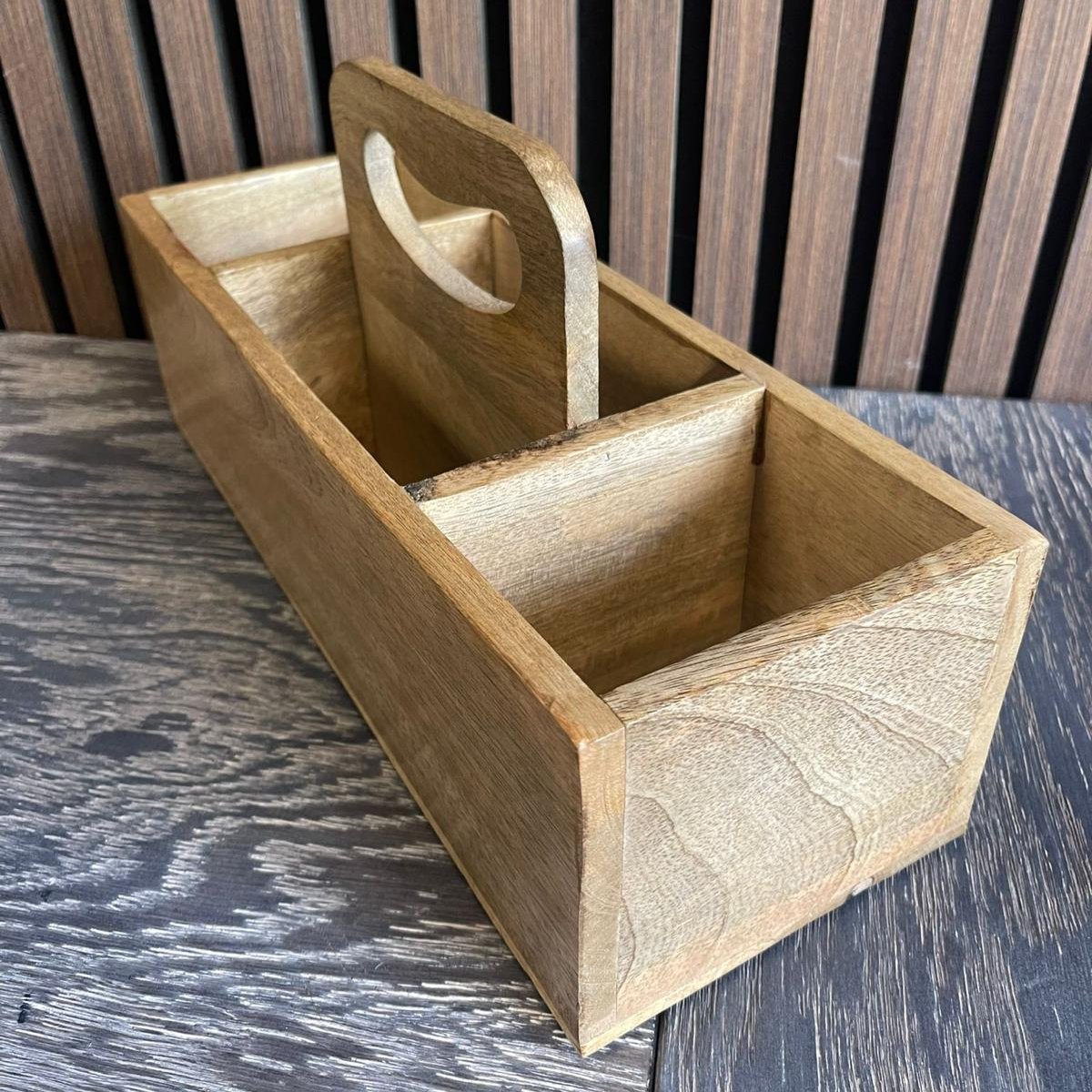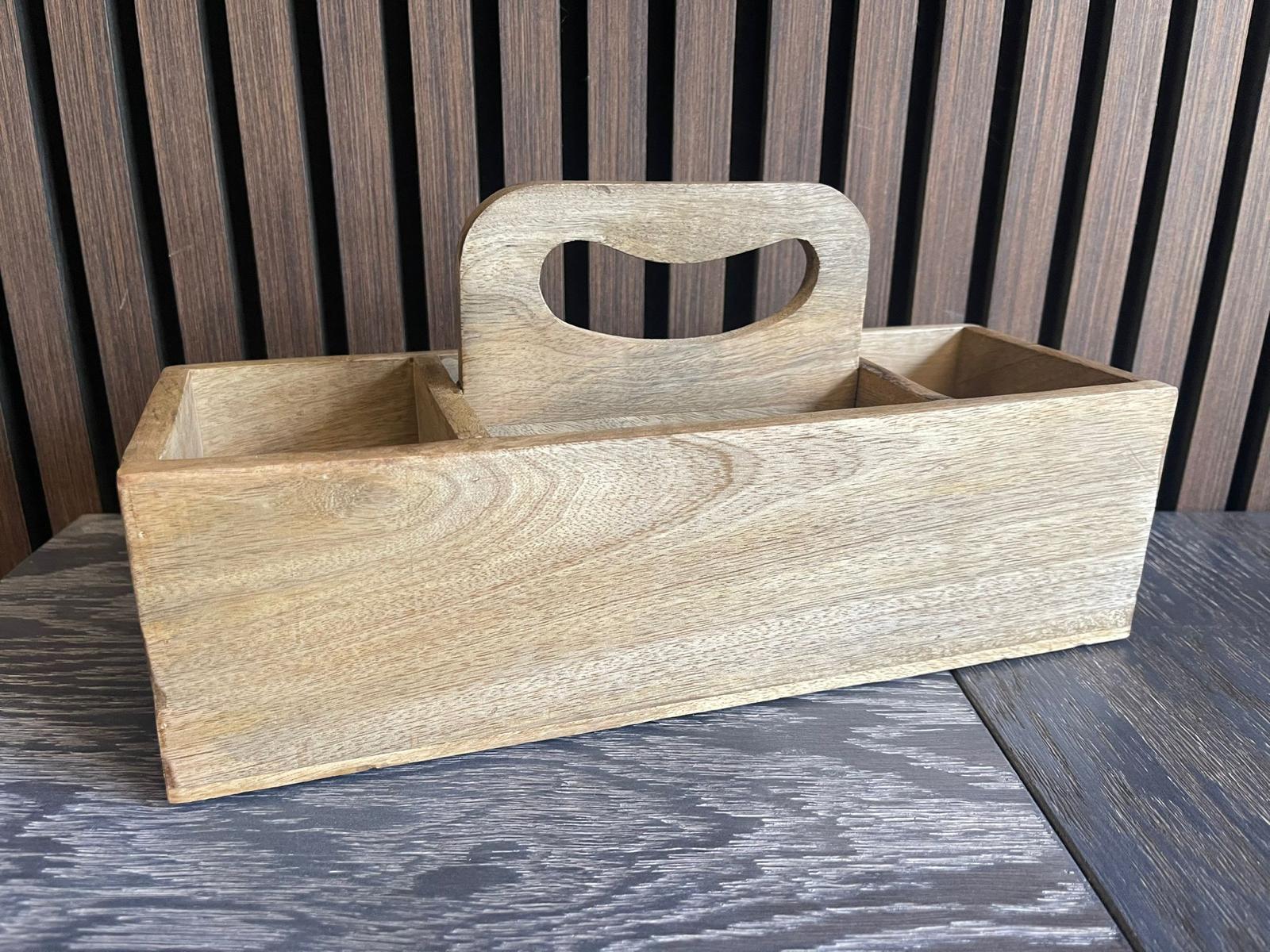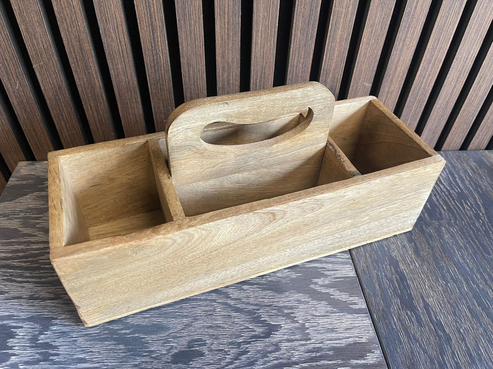 Høj bakke med fire rum i mangotræ. Perfekt til at holde styr på genstande i køkkenet, på kontoret eller lignende. Højden er cirka 35 cm og 13 cm i diameter.